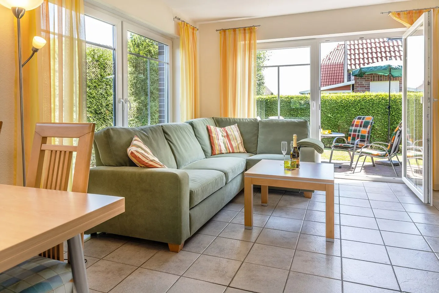 Wohn-/Essbereich mit Sat- TV, Stereoanlage, offene Küche, Kinderhochstuhl, Gäste- WC, Waschmaschine/ Trockner, Abstellraum, Terrasse mit Garten in Südlage, Gartenmöbel.