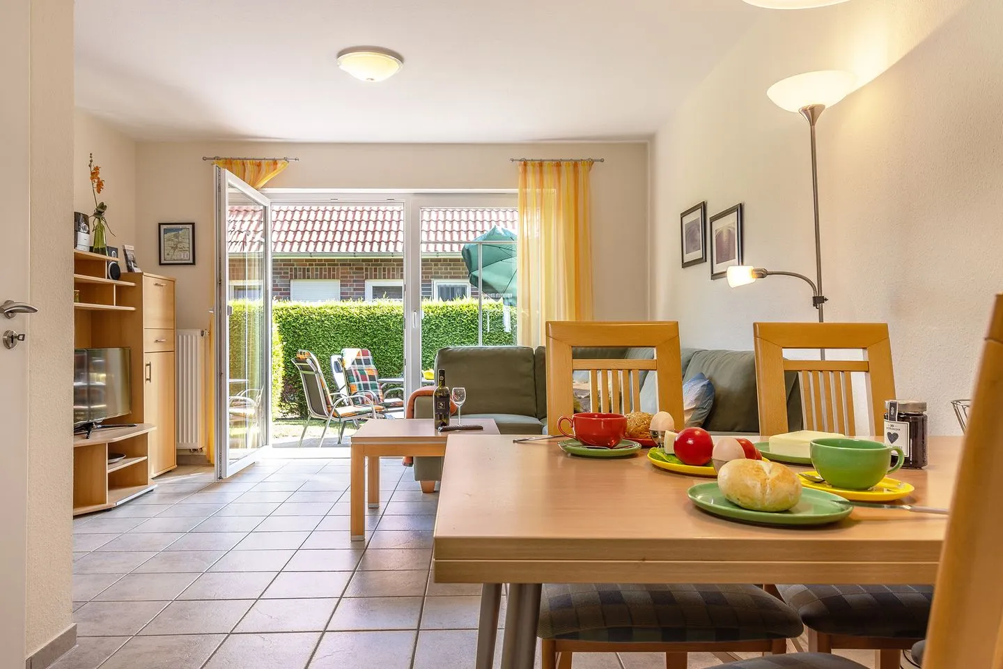 Wohn-/Essbereich mit Sat- TV, Stereoanlage, offene Küche, Kinderhochstuhl, Gäste- WC, Waschmaschine/ Trockner, Abstellraum, Terrasse mit Garten in Südlage, Gartenmöbel.