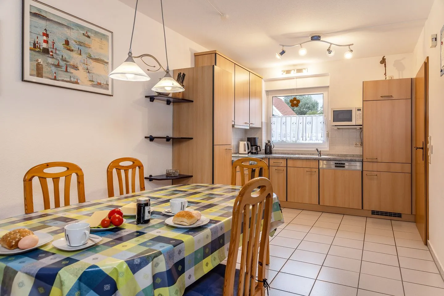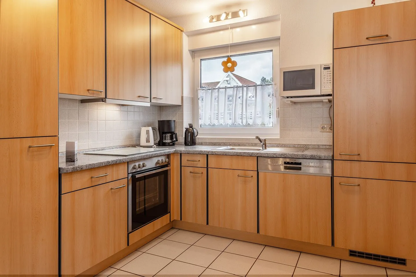 Angrenzende offene Küche mit Spülmaschine, Heißluftbackofen etc.